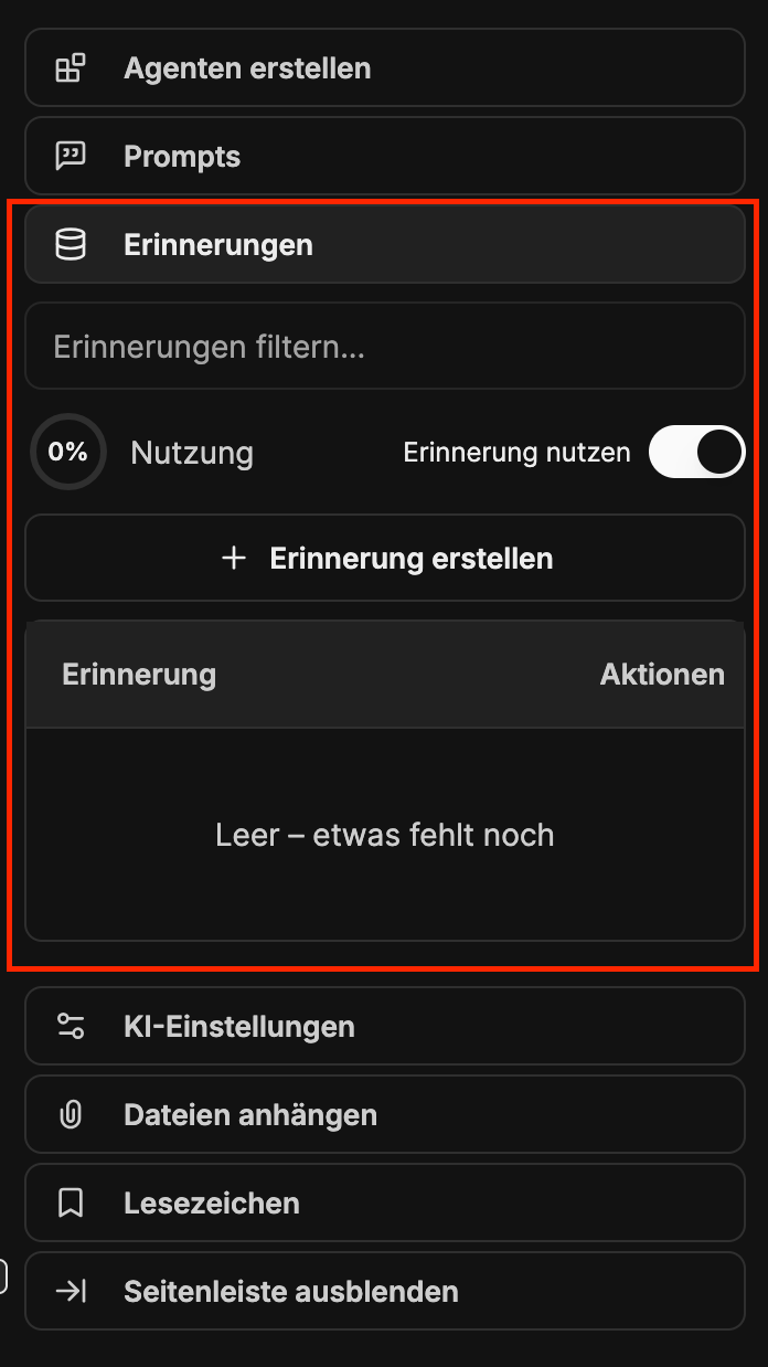 8. Die Erinnerungen-Funktion speichert Informationen über mehrere Unterhaltungen hinweg, um personalisierte und kontextbezogene Antworten zu ermöglichen. Wenn Erinnerungen in der Seitenleiste aktiviert wurden, kann die KI Nutzerpräferenzen, wichtige Fakten und den Gesprächskontext abrufen, um künftige Interaktionen zu verbessern.