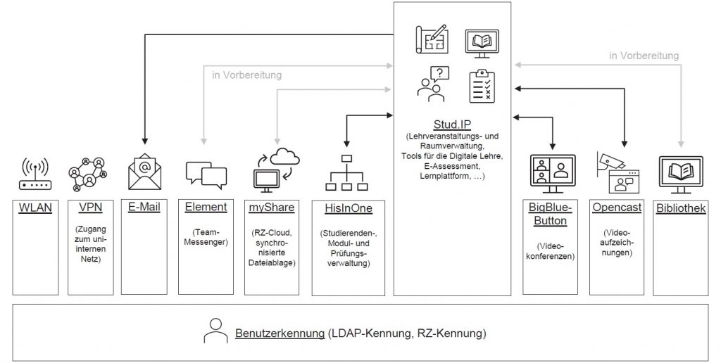 Das Herzstück des digitalen Lehrpakets an der Universität Osnabrück bildet Stud.IP. Hier verwalten alle Angehörigen der Universität ihre Veranstaltungen, legen Zeiten und Ablaufpläne fest, stellen Dateien und Informationen zur Verfügung oder verwalten die Liste der Teilnehmenden. Innerhalb der Veranstaltungsseite in Stud.IP stehen den Lehrenden viele weitere Dienste zur Verfügung, alle mit direkter Einbindung in die Veranstaltung.